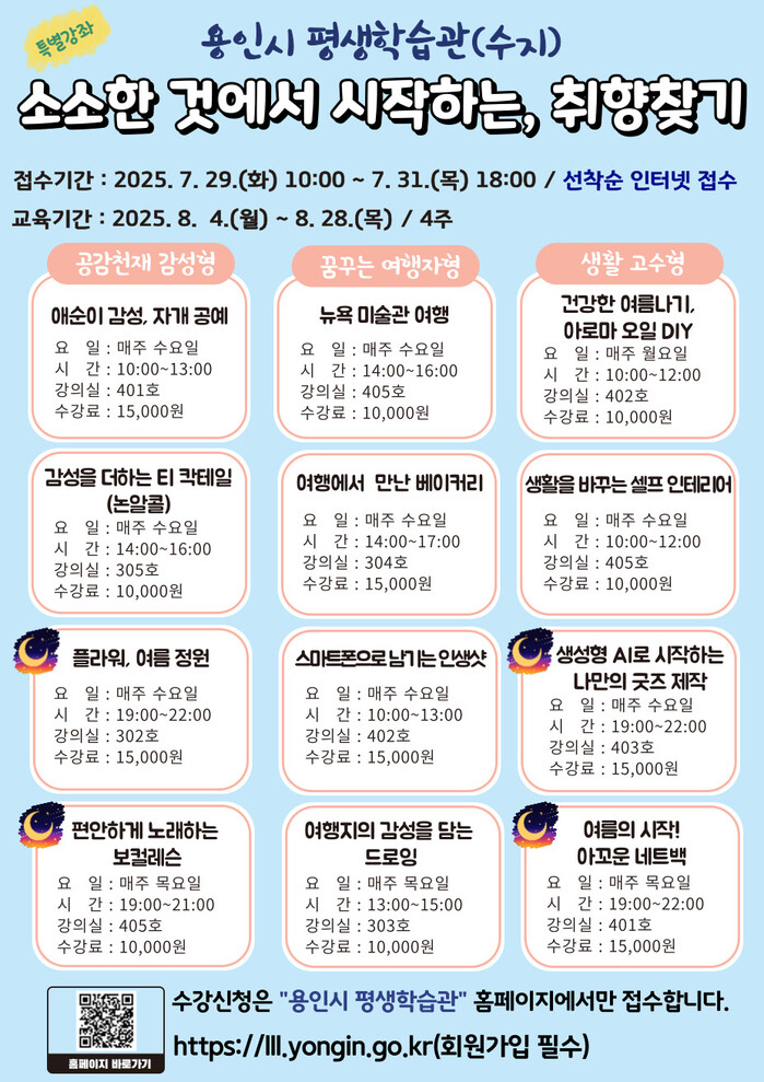 접수는 용인시 평생학습관 홈페이지를 통해 온라인(모바일 포함) 선착순으로 진행된다.