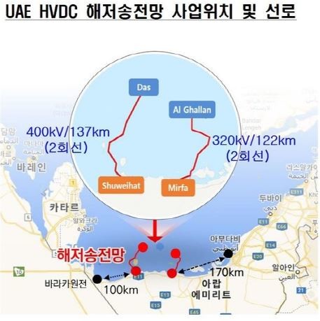 이번 사업은 지난해 12월 한전 컨소시엄(한전+큐슈전력+EDF)이 국제 경쟁입찰로 수주했으며, MENA(중동-북아프리카) 지역 최초로 초고압 직류 송전(High Voltage Direct Current) 기술을 적용하여 3.2 기가와트(GW) 용량의 해저 케이블 및 변환소를 2025년까지 건설하고 35년간 운영하는 사업이다.