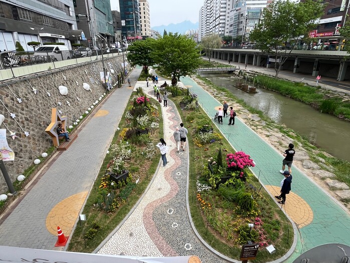 구는 이번 별빛내린천 매력정원 조성 사업에 콘크리트 구조물에서도 사계절을 느낄 수 있는 사계절 꽃 정원과 모바일 플랜터 등을 활용해 꽃길을 조성했다.