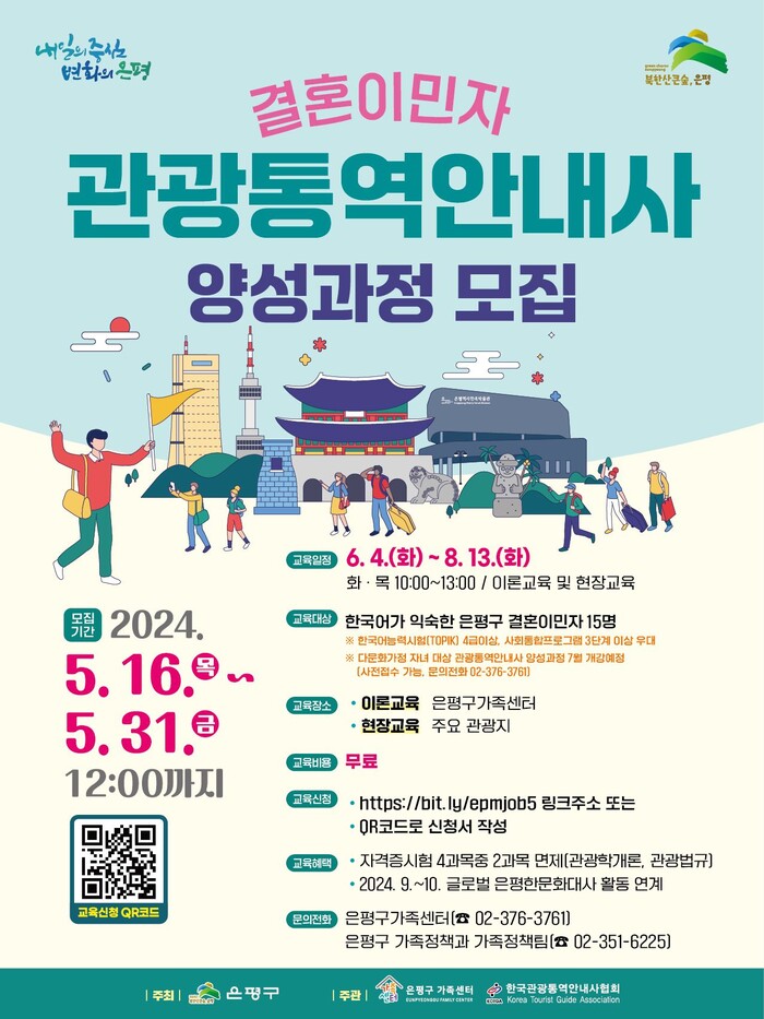 은평구 관광통역안내사 양성 교육과정은 관광학개론, 관광법규, 관광안내실무, 주요 관광지 현장실습을 통해 결혼이민자의 눈높이에 맞춰 필기시험과 면접시험까지 대비한다. 특히 현장실습을 통해 생생한 국사 교육을 강화할 계획이다.