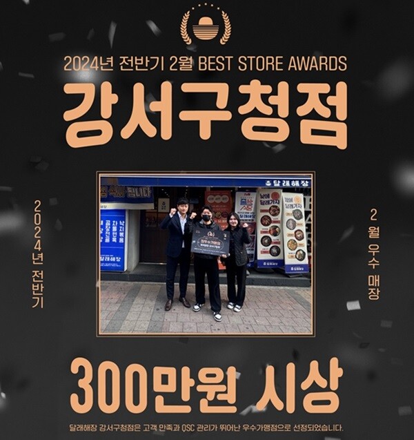 달래해장 관계자는 "지난 1월 천안신불당점에 이어 강서구청점이 전반기 2월 우수 가맹점으로 선정됐다"며 "고객 만족, QSC 관리가 뛰어난 점이 우수 가맹점으로 선정된 이유이며 응원과 격려 차원에서 300만원 시상도 진행했다"고 말했다.
