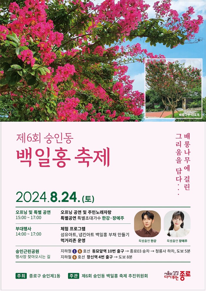 [시민일보 = 이대우 기자] 서울 종로구(구청장 정문헌) 숭인1동이 24일 14시부터 숭인근린공원에서 「제6회 숭인동 백일홍 축제」를 개최한다.