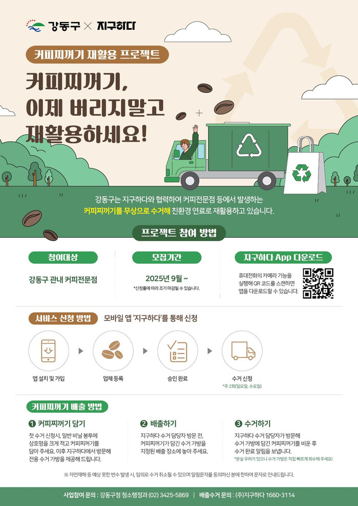 참여를 희망하는 업체는 홍보물에 담긴 정보무늬(QR코드)를 통해 모바일 앱 ‘지구하다’에 가입 및 업체 등록한 뒤, 수거 신청을 하여 전용 수거 가방에 커피찌꺼기를 담아 점포 앞에 배출하면 된다. 수거 담당자가 매장을 직접 방문해 가져가며, 첫 수거 때는 구가 제작한 전용 가방을 제공한다.