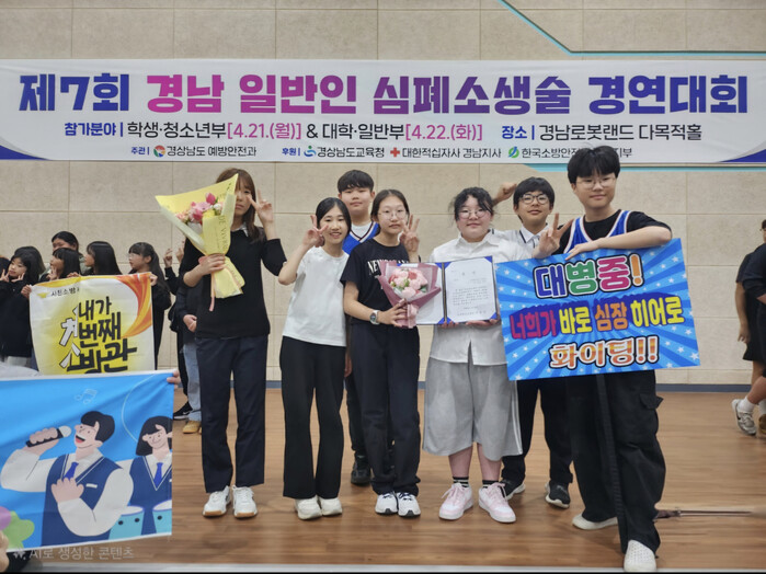 합천소방서 대표로 출전한 대병중학교 팀(1학년 7명)은 학교 운동장에서 축구 경기 중 심정지를 일으키는 상황을 재현한 실감나는 연기와 정확한 심폐소생술 시행으로 심사위원들의 높은 평가를 받으며 학생·청소년부에서 최우수상을 수상했다.
