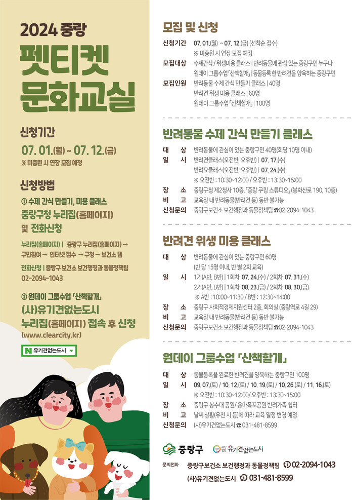 [시민일보 = 여영준 기자] 중랑구(구청장 류경기)는 반려인과 비반려인 모두 공감할 수 있는 펫티켓 문화를 만들기 위해 오는 17일~11월16일 ‘2024 중랑 펫티켓 문화교실’을 운영한다고 밝혔다.