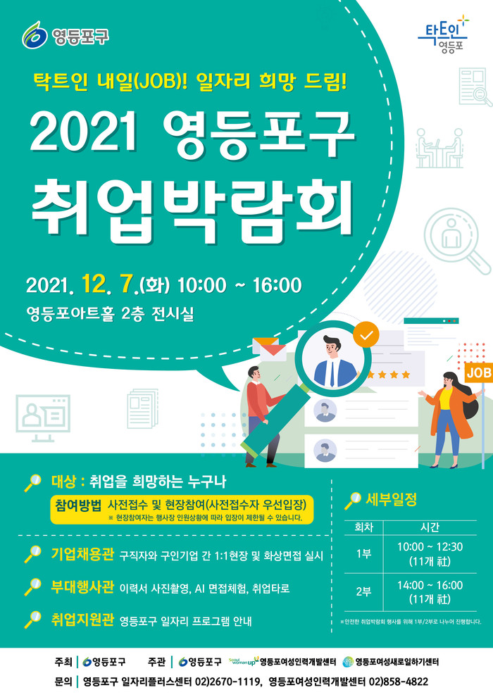 [시민일보 = 여영준 기자] 영등포구(구청장 채현일)는 7일 영등포아트홀에서 ‘2021 영등포구 취업박람회’를 개최한다고 밝혔다.