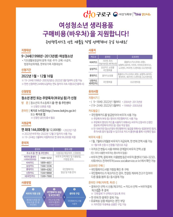 구 관계자는 “이번 지원 대상 확대를 통해 더 많은 청소년이 생리용품 구매에 대한 경제적 부담을 덜기를 바란다”며 “앞으로도 청소년들이 건강하게 성장할 수 있는 환경을 만드는 데 최선을 다하겠다”고 전했다.