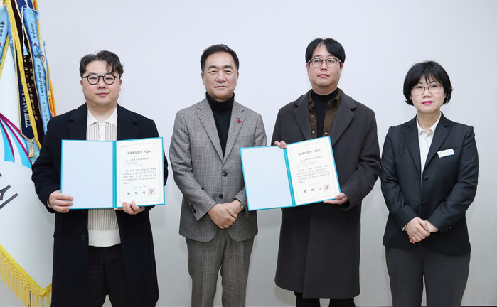 | ▲ 사진 설명: 왼쪽부터 현촌 한마음 골목형 상점가 박종혁 회장, 평택시청 정장선 시장, 소사벌 에듀타운 골목형 상점가 김정수 회장, 평택시청 일자리경제과 김보경 과장 |