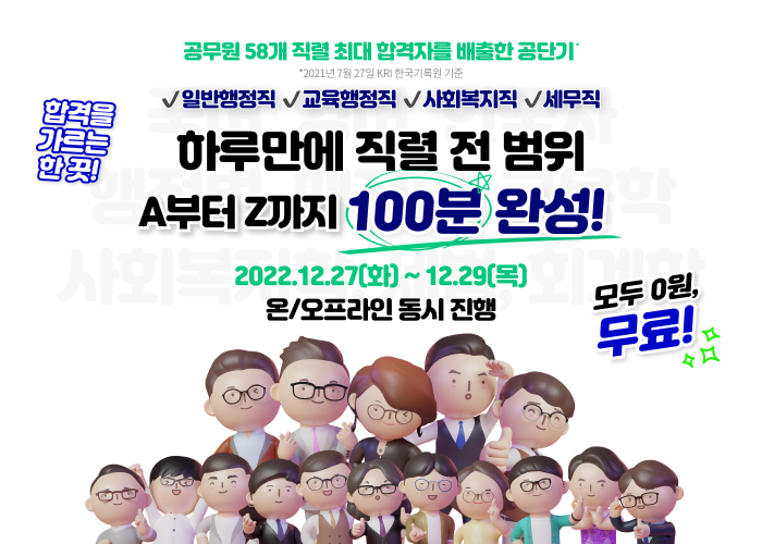 시험 100일을 앞둔 시점에서 정리하는 특강인 만큼 이번에는 각 직렬별 공단기 전문 교수진들(▲국어 이선재·김병태·권규호 ▲영어 이동기·심우철·김수환 ▲한국사 문동균·강민성·신영식 ▲행정법 박준철·윤우혁·김현석 ▲사회복지학 김유경 ▲회계학 김용재 ▲세법 이진욱 ▲교육학 이경범)이 참여한다.