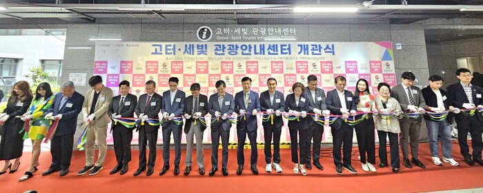 | ▲ 고터·세빛 관광안내센터 개관식에 참석한 전선수 구청장(가운데)이 내빈들과 함께 리본 커팅식을 하고 있다. (사진=서초구청 제공) |