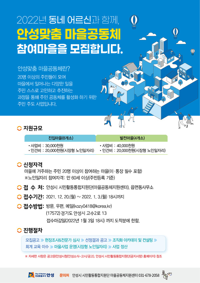 『2022년 동네 어르신과 함께하는, 안성맞춤 마을공동체 지원공모사업』은 2022년 1월 3일까지 신청을 받아 진입마을 8개소, 발전마을 4개소를 선정할 계획이다.