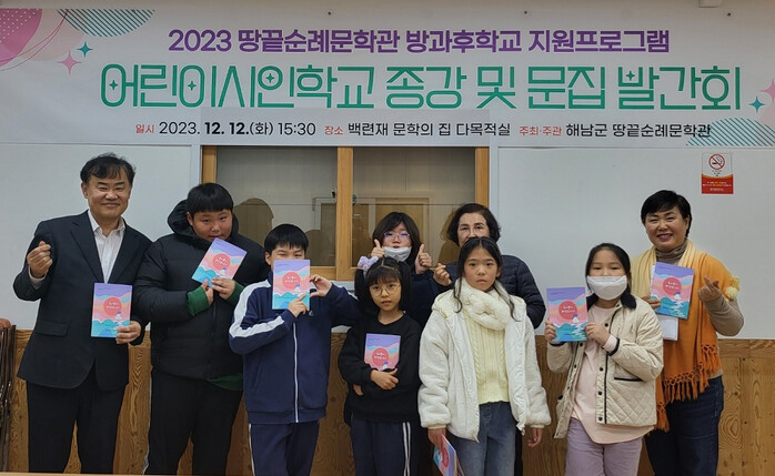 | ▲ 땅끝순레문학관, 어린이 시인학교 종강 및 문집 발간호 후 참여 학생들과 기념촬영 / 해남군 제공 |