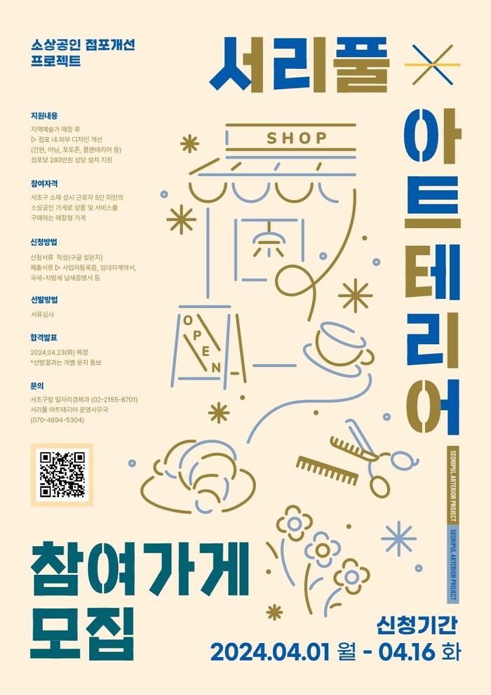 ‘서리풀 아트테리어(Art+Interior)’ 사업은 지역 예술가의 창작재능을 통해 동네 점포를 차별화된 분위기로 새롭게 개선하는 사업으로, 가게 내·외부 인테리어 개선부터 브랜드, 로고, 상품패키지 디자인 제작까지 점포 소상공인에게 맞춤형으로 지원된다. 구에서 소상공인에게는 점포 인테리어 개선을 지원하고, 예술가에게는 재료비와 활동비를 지원한다.