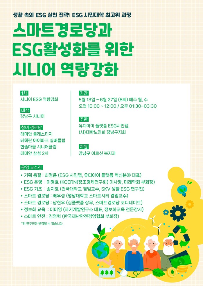 참여 경로당은 레미안 블레스티지, 테헤란 아이파크 실버클럽, 한솔마을 시니어클럽, 래미안 삼성2차 경로당 등 4곳이다. 교육은 ㈜유디아이의 ESG 시민랩(대표 최정윤)의 전문 강사진이 나섰다. 지난 5월 13일 첫 오리엔테이션을 실시하고 6월 27일까지 8주간 매주 월·수요일에 교육을 진행한다. 교육 과정으로 ▲지구환경과 우리의 공간(E) ▲공동체의 개선과 돌봄(S와 G) ▲4차 산업의 사회적 변화와 시니어 라이프 ▲ESG 현장 탐방 ▲스마트 기기 활용법 등을 운영한다.
