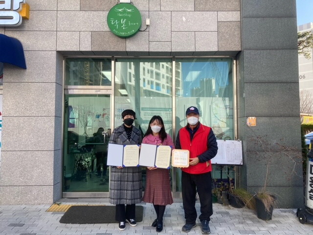 충남 아산시 배방읍 행복키움추진단이 20일 탁본헤어와 후원협약을 체결했다. 협약으로 탁본헤어는 매월 지역내 취약계층 청소년 3명을 대상으로 매직·염색 등의 미용 서비스를 무료로 제공할 예정이다. 사진은 후원협약 후 관계자들이 기념촬영을 하는 모습. (사진제공=아산시청)
