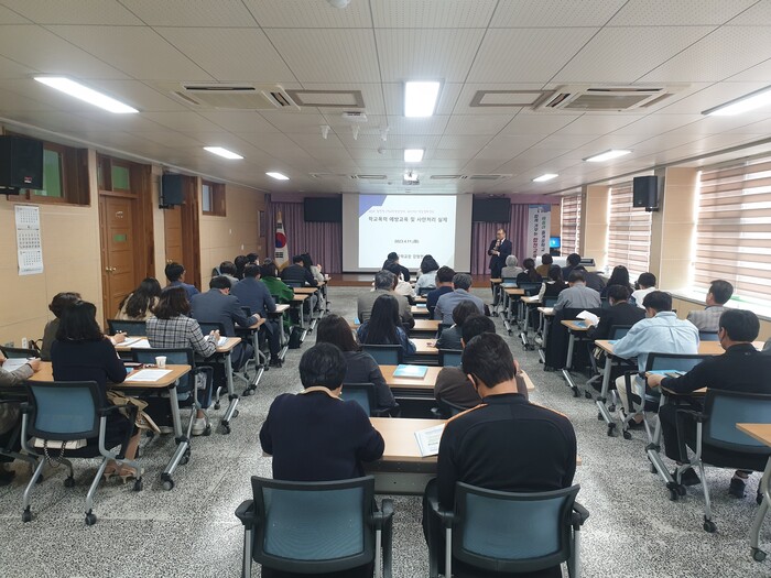 강사로 초빙된 호암중학교 교장 강형천은 강의를 통해 최근 학교 내에서 자주 발생하는 사이버폭력, 언어폭력 등 학교폭력 양상에 대해 상세하게 설명했다. 그리고 학교폭력 사안과 상황별로 선제적으로 대응하는 요령을 안내하고, 학교폭력 관련 학생들의 갈등조정과 관계회복을 위한 새로운 패러다임 구축에 대해 설명했다.