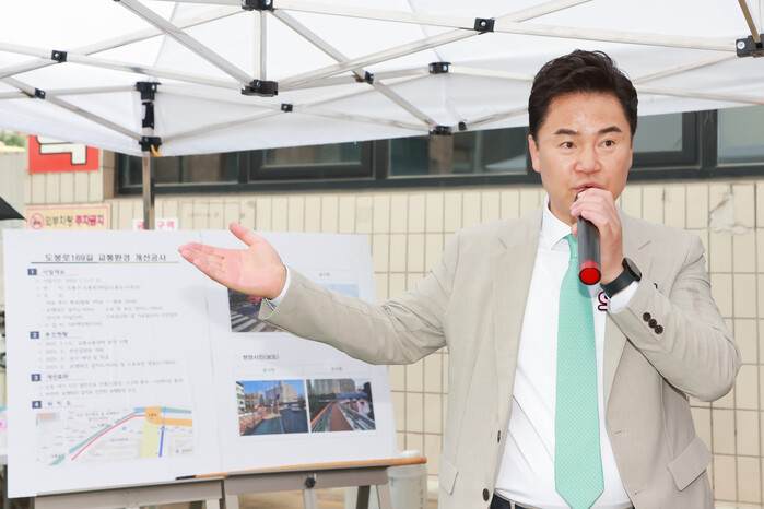 | ▲ 오언석 도봉구청장이 주민에게 ‘도봉로169길 교통환경 개선공사’ 추진 현황에 대해 설명하고 있다. (사진=도봉구청 제공) |