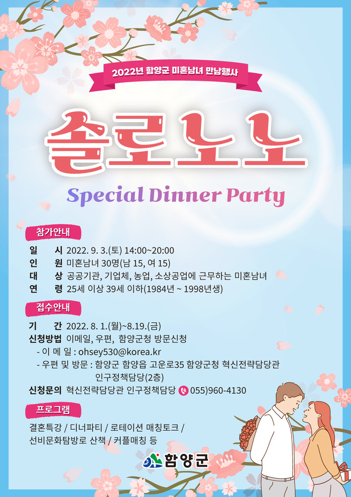 참여 대상은 함양군내 공공기관, 기업체, 농업, 소상공업 등에 종사하는 25세 이상 39세 이하 미혼 남녀 각각 15명으로, 이메일이나 우편, 방문접수를 통해 신청하면 된다.