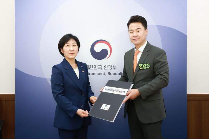 | ▲ 오언석 도봉구청장(사진 오른쪽)이 우이신설연장선 전략환경영향평가 원안통과를 위해 한화진 환경부장관(사진 왼쪽)과 면담을 실시했다(2023. 6. 14.) (사진=도봉구청 제공) |