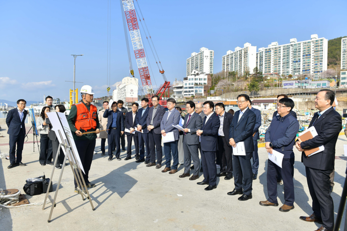 이날 정 시장은 간부 공무원 30여 명과 국동항을 방문, 시공사로부터 사업 추진 현황과 향후 계획을 보고받은 후 경도에 입도해 공사 현장을 살폈다.
