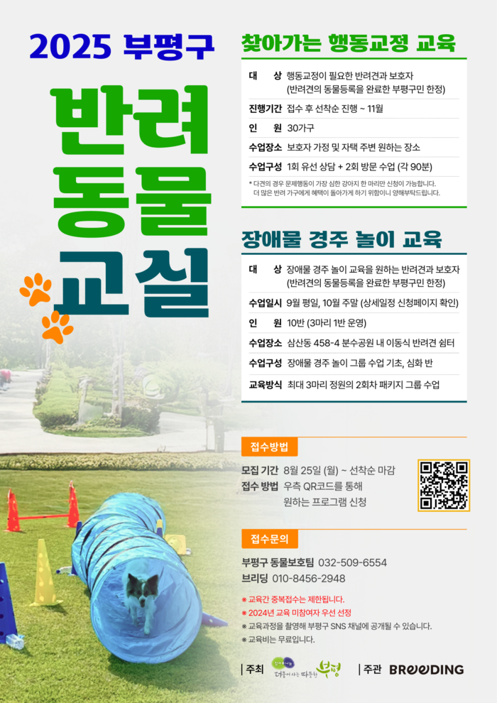 동물등록이 된 반려견을 키우는 부평구민은 누구나 두 교육에 참여할 수 있으며, 온라인으로 신청 가능하다. 단, 지난해 교육 미참여자에게 우선순위가 부여된다.
