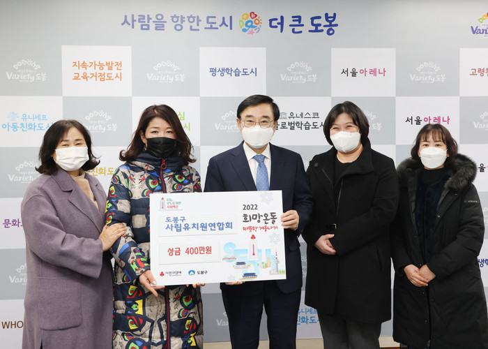 서울 도봉구는 지난 13일 ‘도봉구사립유치원연합회’로부터 따뜻한겨울나기 이웃돕기 성금 400만원을 전달받았다. 사진은 전달식에서 이동진 구청장(가운데)이 관계자들과 기념촬영을 하는 모습. (사진제공=도봉구청)