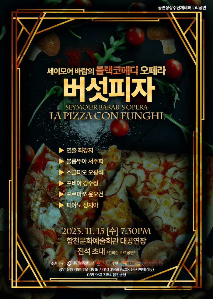 ‘버섯피자’ 공연은 네 남녀의 얽히고설킨 사랑을 우아하고도 코믹하게 그려낸 블랙코미디 작품이다. 현대 희극 오페라의 대가인 세이모어 바랍(Seymour Barab)의 재치 넘치는 작곡으로 ‘코믹 오페라’라는 새로운 장르를 만들어 비극적 요소를 재밌게 그려내고 있다.