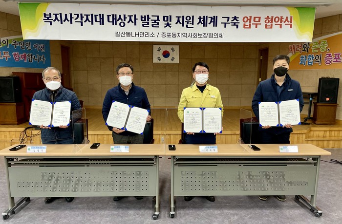 경기 이천시 증포동 행정복지센터·지역사회보장협의체가 최근 LH이천갈산관리사무소 2곳과 복지사각지대 발굴·지원을 위한 업무협약을 체결했다. 협약으로 관리사무소는 아파트내 위기가구 발굴에 협조하고, 맞춤형복지팀은 발굴된 가구를 방문·상담하며 지역사회보장협의체와 협력해 지원하게 된다. 사진은 협약식에서 관계자들이 기념촬영을 하는 모습. (사진제공=이천시청)