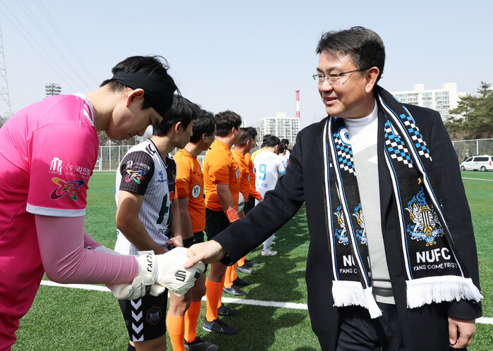 | ▲ 오승록 노원구청장이 17일 오후 서울 노원구 마들스포츠타운 축구장에서 열린 ‘노원유나이티드FC 홈개막경기(노원유나이티드 VS 평택시티즌)’에 참석해 선수들을 격려하고 있다. (사진=노원구청 제공) |