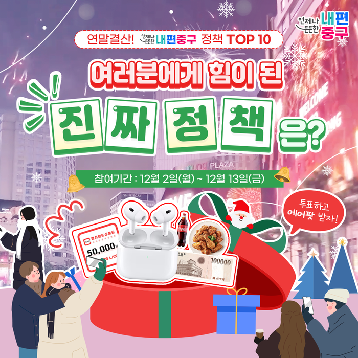 투표는 구의 공식 플랫폼 ‘온통중구’를 통해 누구나 참여할 수 있다. 참여자 중 106명을 추첨해 다양한 경품을 증정할 예정이다. 무선이어폰(1명), 10만 원 상당 백화점 상품권(2명), 5만 원 상당 문화상품권(3명), 치킨 기프티콘(100명)이 경품으로 준비돼 있다.