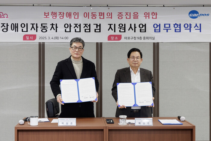마포구가 최근 구청 중회의실에서 ‘장애인 자동차 안전점검 지원사업 업무 협약식’을 개최했다. 사진은 박강수 구청장(오른쪽)이 박상춘 서울시자동차전문정비사업조합 마포구지회장과 협약을 맺고 기념촬영을 하고 있는 모습. (사진=마포구청 제공)