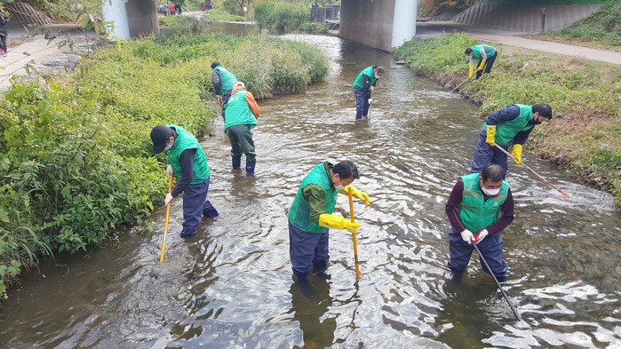 경기 수원시 장안구 정자3동 새마을협의회가 최근 ‘서호천 정화 활동’을 벌여 지역내 SKC공장 후문 및 동원 F&B 미생물처리장 주변 등 악취 발생지역을 중심으로 서호천 바닥의 퇴적물 및 각종 쓰레기 등을 수거했다. 사진은 관계자들이 서호천 바닥에서 퇴적물과 쓰레기를 수거하고 있는 모습. (사진제공=장안시청)