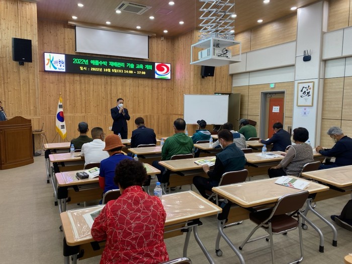 이날 교육은 충남농업기술원 수박연구소 김태일 박사(전 소장)를 초빙해 애플수박의 토양관리, 생리장해, 병해충 방제 기술을 교육했고, 지난 5년간 재배해온 농업인들의 생산기술 수준 차이가 심하고 이는 농가간 소득 격차로 이어져 이러한 문제점을 해소하고 새로운 소득 작목으로 정착시키는 데 중점을 두었다.