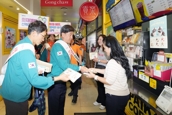 경기 광주시와 광주소방서는 23일 유동 인구가 많은 광주종합터미널 일원에서 ‘화재 예방 안전 캠페인’을 개최했다. 이번 캠페인은 건조한 가을철을 맞아 시민들의 화재 안전 경각심을 높이고 안전 문화를 확산하기 위해 민관이 합동으로 마련했다. 사진은방세환 시장이 시민들에게 홍보물을 전달하는 모습. (사진=광주시청 제공)