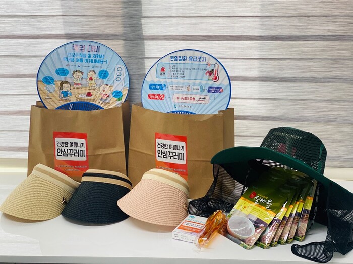안심꾸러미에는 고단백 영양식과 함께 여름용 모자, 폭염대비 예방부채, 일회용 밴드 등 어르신들의 건강한 여름나기에 도움이 되는 물품들이 담겼다.