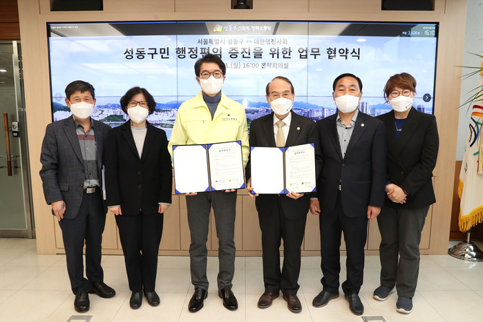 성동구는 최근 대한행정사회와 행정사 무료 상담실 운영을 위한 업무협약을 체결했다. 상담은 오는 4월부터 매주 금요일 오후 2시에 성동구청 1층 전문 상담실에서 진행되며, 상담분야는 행정기관에 제출하는 진정, 건의 및 인·허가, 면허 등 서류 작성 대행 등이다. 사진은 정원오 구청장(왼쪽 세 번째)과 관계자들이 기념촬영을 하는 모습. (사진제공=성동구청)