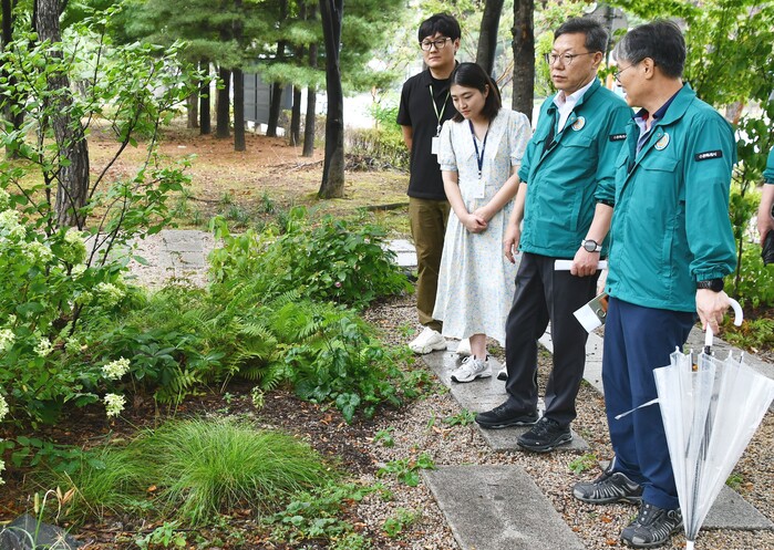 박사승 경기 수원시 영통구 구청장은 11일 지역내 조성된 주요 손바닥정원 5곳을 순차적으로 돌아보며 현장을 점검했다. 이날 법원지하차도 상부정원(매탄동 910) 등 비교적 규모가 큰 손바닥 정원을 순차적으로 돌아봤다. 사진은 박 구청장(오른쪽 두 번째)이 관계자들과 현장을 점검하고 있는 모습. (사진=영통구청 제공)