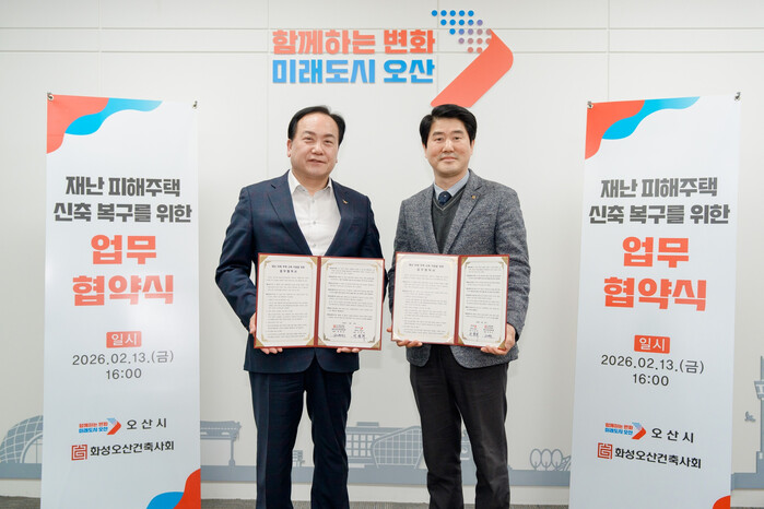 경기 오산시가 최근 시청에서 화성오산건축사회와 ‘재난 피해주택 신축 지원을 위한 업무협약’을 체결했다. 이번 협약은 대형 재난으로 주택이 파손돼 복구에 어려움을 겪는 이재민을 대상으로, 건축 분야의 전문성과 시의 행정 지원을 연계해 실질적인 주거 회복을 돕기 위해 마련됐다. 사진은 이권재 시장(왼쪽)이 협약서를 들고 기념 촬영을 하는 모습. (사진=오산시청 제공)