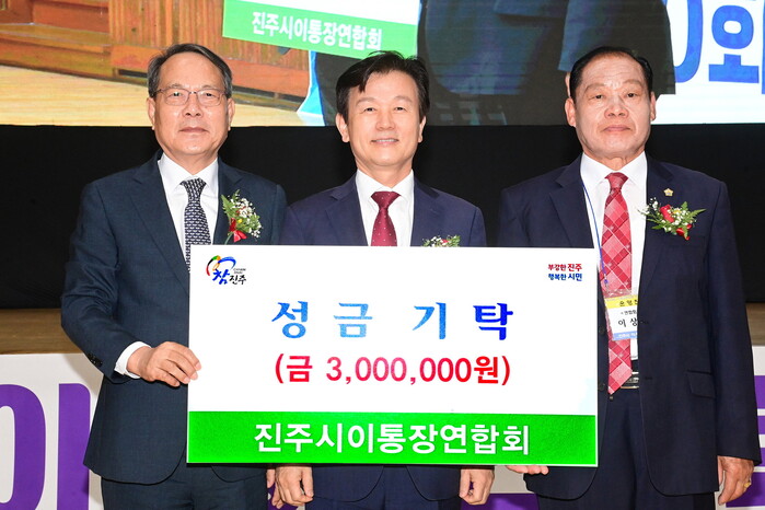 진주시 이·통장연합회(회장 이상호)는 24일 개최한 한마음대회 행사장에서 진주시 관내 전 읍면동 이·통장들의 뜻을 모아 어려운 이웃을 돕기 위한 성금 300만 원을 진주시복지재단(이사장 이성갑)에 기탁했다.
