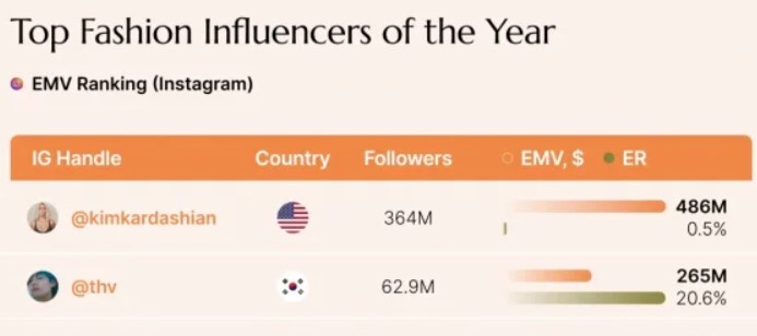 이날 프랑스 인플루언서 마케팅 플랫폼 '레프티'(Lefty)가 발표한 2023년도 '올해의 톱 패션 인플루언서'(Top Fashion influencers of the year) 부문에서 방탄소년단 뷔는 남자 셀럽 1위, 전체 순위 3위를 차지해 이목을 집중시켰다.