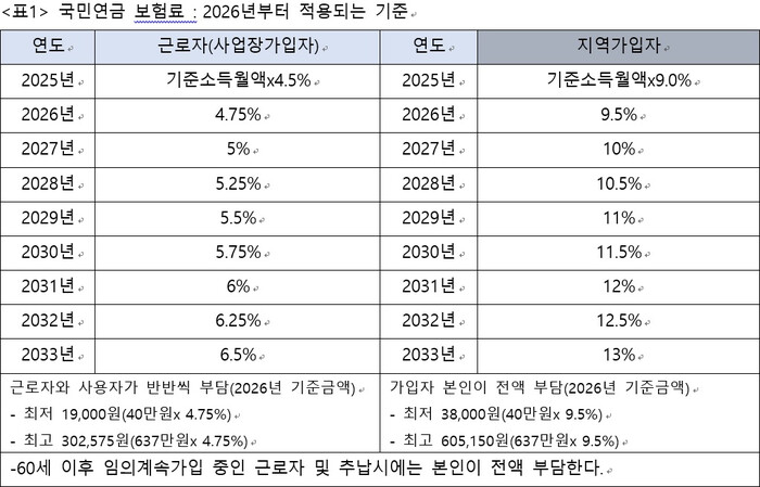 국민연금 보험료는 가입자의 기준소득월액에 보험료율(2025년까지 9%, 2026년부터 9.5~13%)을 곱하여 산정한다.