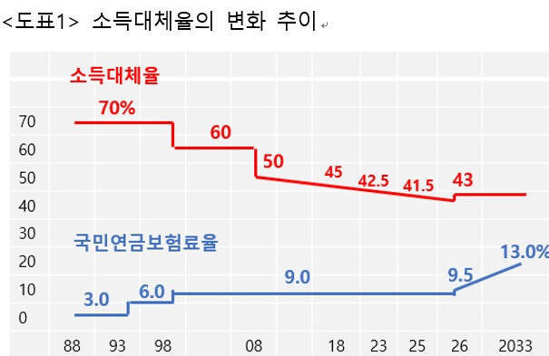 소득대체율은 현역시절 평균소득에 대해 연금이 몇 %를 커버하는지를 나타내는 지표로서, 2025년 41.5%가 적용되었으나 2026년부터 43%가 적용될 예정이다. 다만 인상된 소득대체율 43%는 2026년 이후 납부한 금액에만 적용된다.