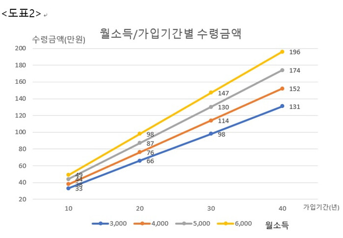 또한 납입기간과 납입금액에 비례하여 수령금액이 증가하는 구조이므로 소득대체율 43%를 기준으로 한 기간별 수령하는 금액은 대략적으로 다음 도표와 같이 생각할 수 있다.