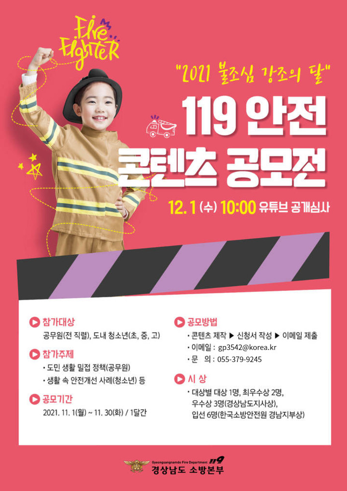 응모 희망자는 이달 말까지 참가 신청서와 4분 이내의 동영상 파일을 양산소방서 예방안전과로 제출하면 된다. 심사는 다음 달 1일 유튜브 생방송으로 진행하며 시상은 대상별 경남도지사상 6점, 한국소방안전원상 6점이다.