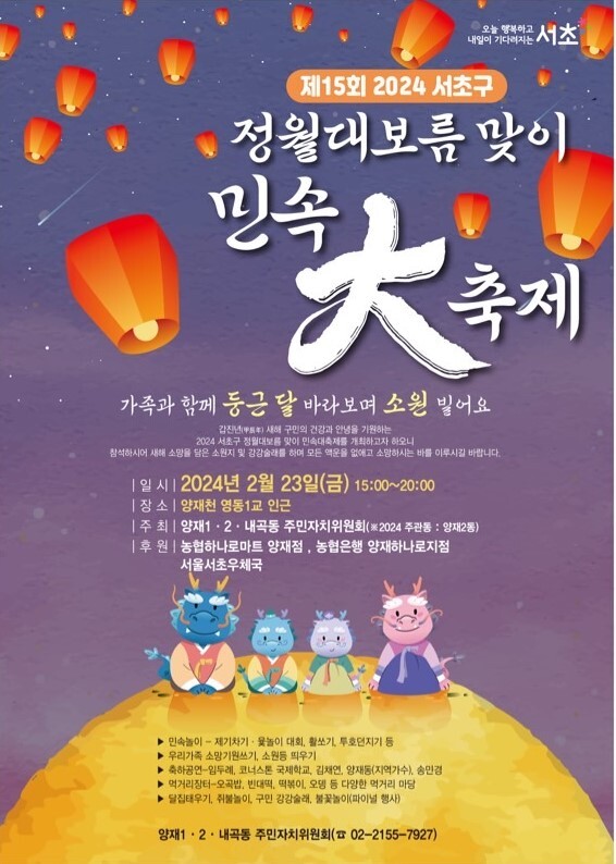 [시민일보 = 이대우 기자] 서초구(구청장 전성수)가 오는 23일 양재천 영동1교 하부에서 오후 3~8시 2024 갑진년 새해 소망을 기원하는 ‘제15회 정월대보름 달맞이 축제’를 개최한다.