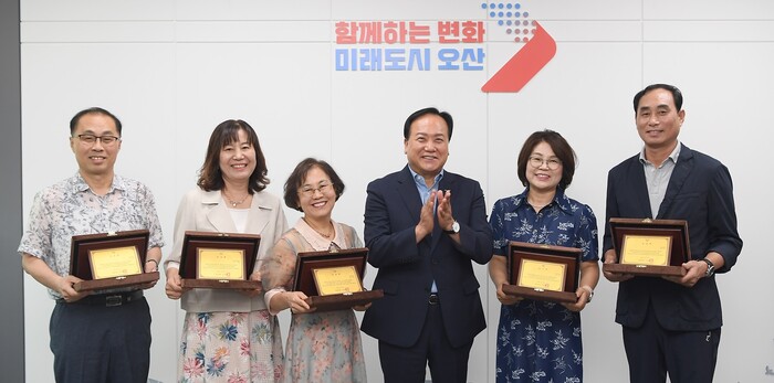 경기 오산시는 최근 교직 생활을 마무리하는 지역내 학교장(4명)과 타 기관으로 전출하는 학교장(1명)에게 공로(감사)패를 전달했다. 사진은 이권재 시장(오른쪽 세 번째)과 금암초등학교 손주원 교장을 비롯한 공로(감사)패 전달 대상자 5명이 함께 기념촬영을 하고 있는 모습. (사진=오산시청 제공)
