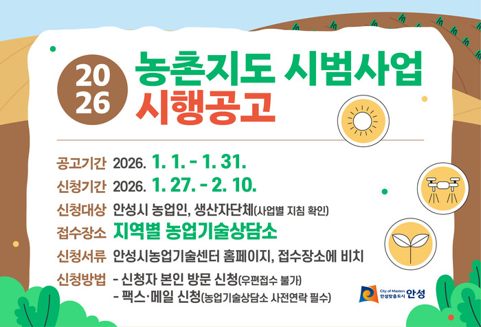 [안성=오왕석 기자] 안성시농업기술센터는 1월 1일부터 2월 10일까지 ‘2026년도 농촌지도 시범사업’ 시행 공고에 따른 신청자를 모집한다.