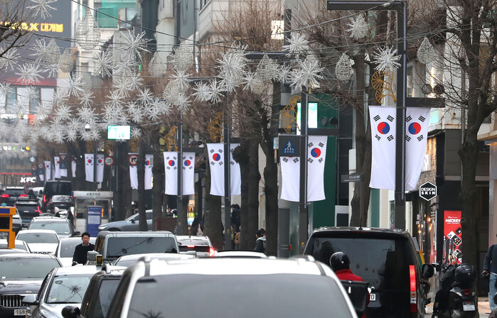 [시민일보 = 이대우 기자] 서울 강남구(구청장 조성명) 신사동이 가로수길 총 680m 구간 양측 가로등주 40개에 배너형 태극기와 만국기를 게양했다.