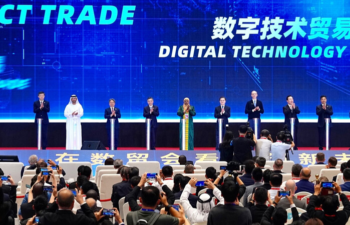 [광주=정찬남 기자] 강기정 광주광역시장(왼 쪽부터 세 번째)이 25일(현지시간) 오전 중국 항저우 그랜드컨벤션센터에서 열린 ‘제4회 항저우 디지털 무역 박람회’ 개막식에 참석해 중국, 아랍에미레이트, 인도네시아 등 주요 외빈들과 개막 퍼포먼스를 한 뒤 기념촬영을 하고 있다, /광주광역시 제공