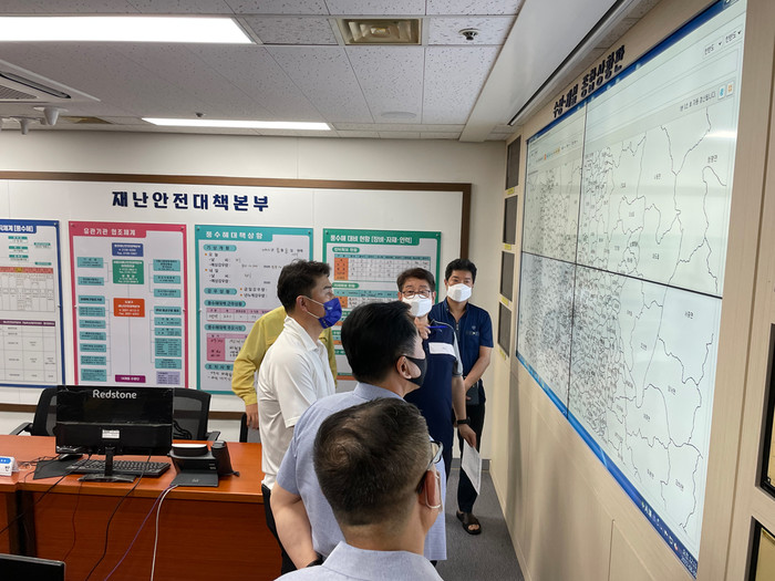 | ▲ 오언석 도봉구청장이 8일 도봉구 풍수해재난안전대책본부를 방문해 수방 상황 등을 점검하고 있는 모습. (사진제공=도봉구청) |